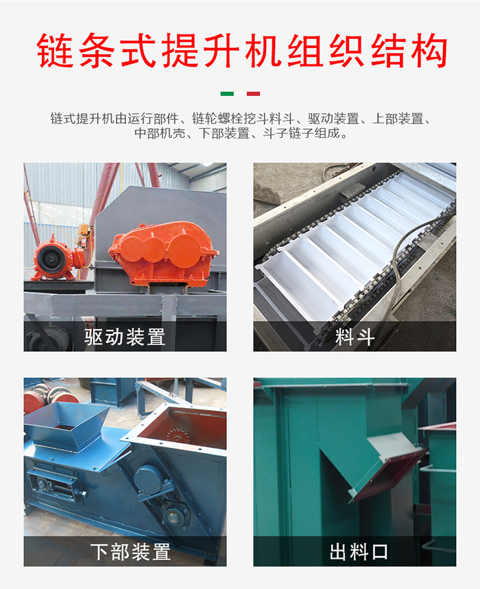 鏈條式提升機(jī)由運行部件、鏈輪螺栓挖斗料斗、驅(qū)動裝置、上部裝置、中部機(jī)殼、下部裝置、斗子鏈子組成。